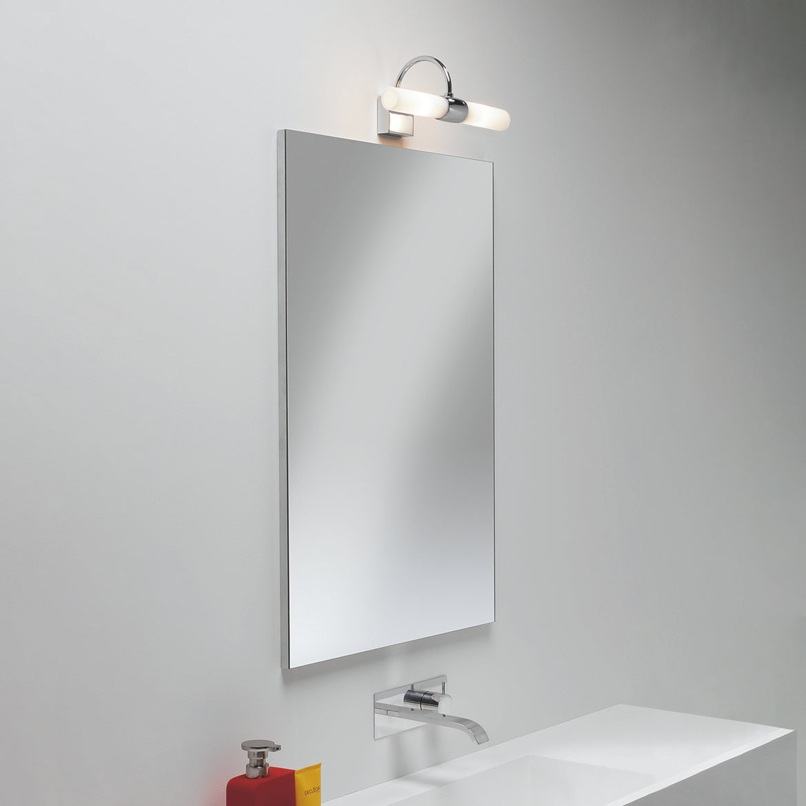 The Dayton mirror light has a polished chrome finish and a frosted glass shade. Manufactured by Astro, this fitting is safety, class 2 and double insulated.