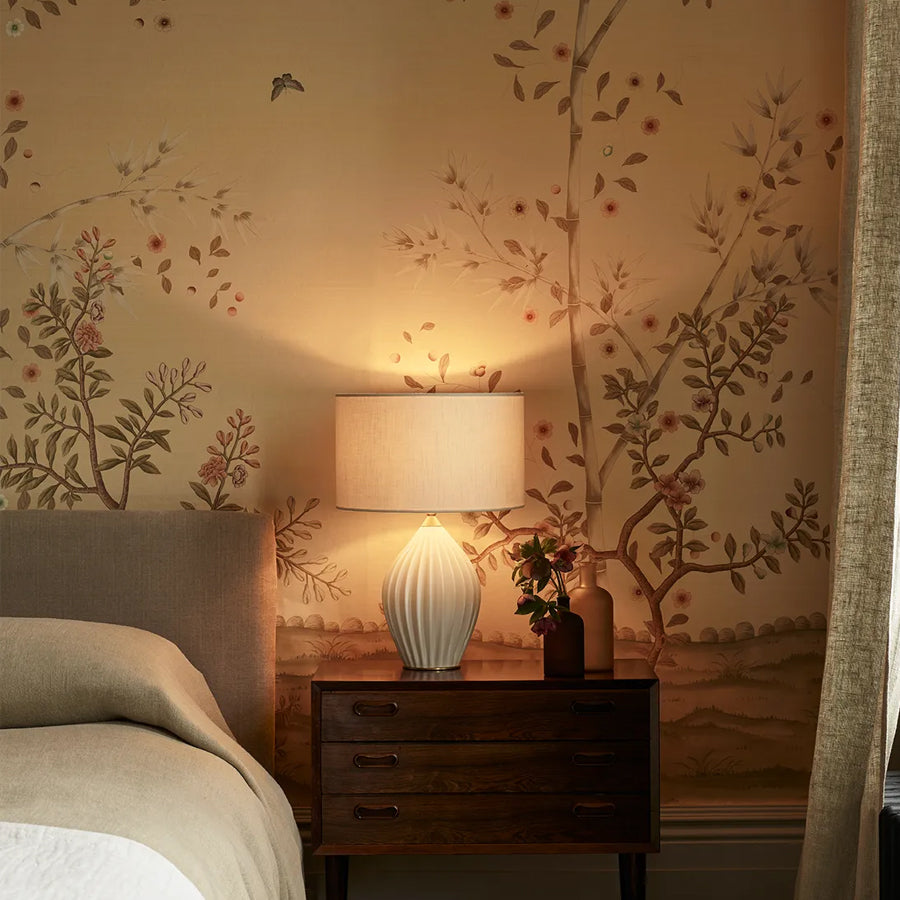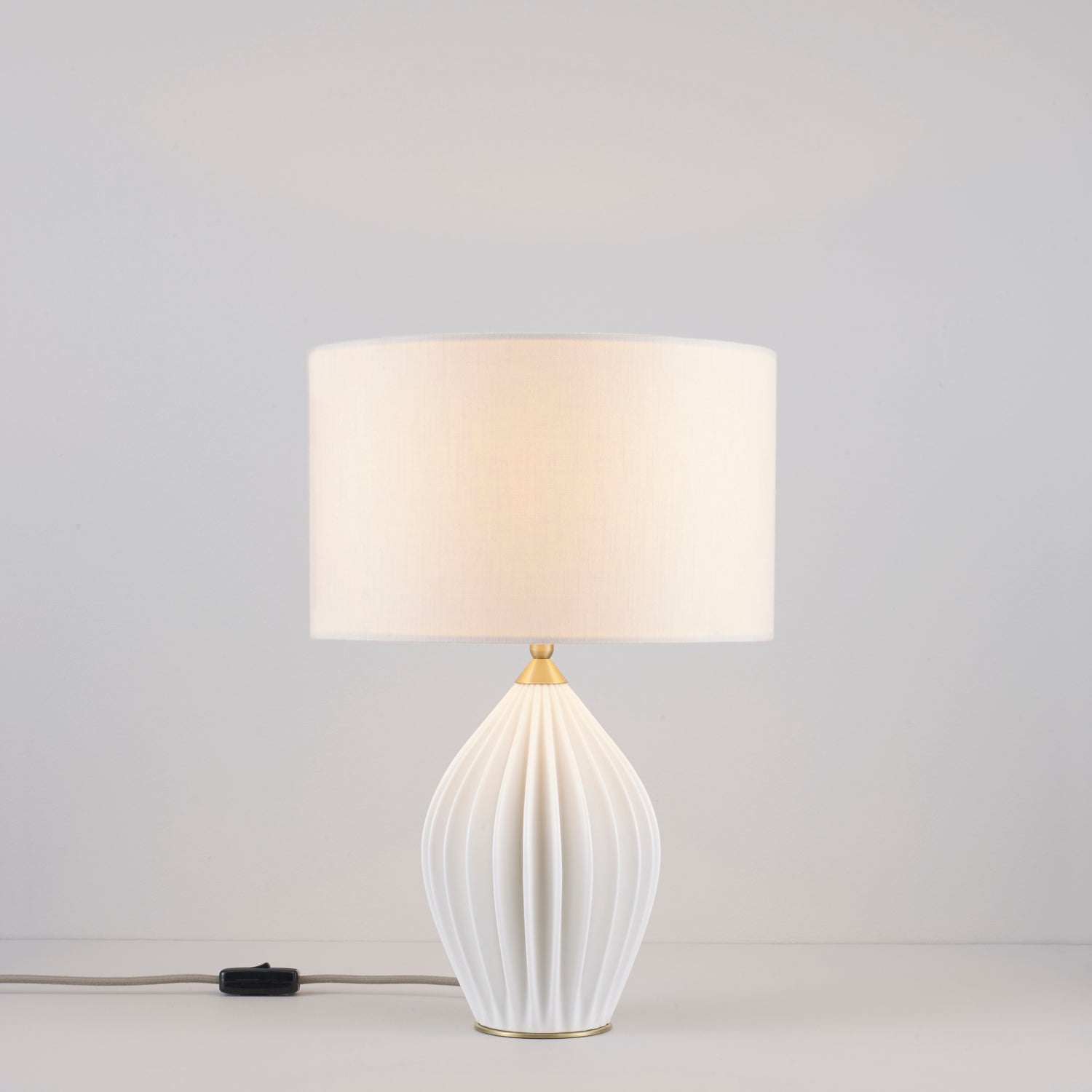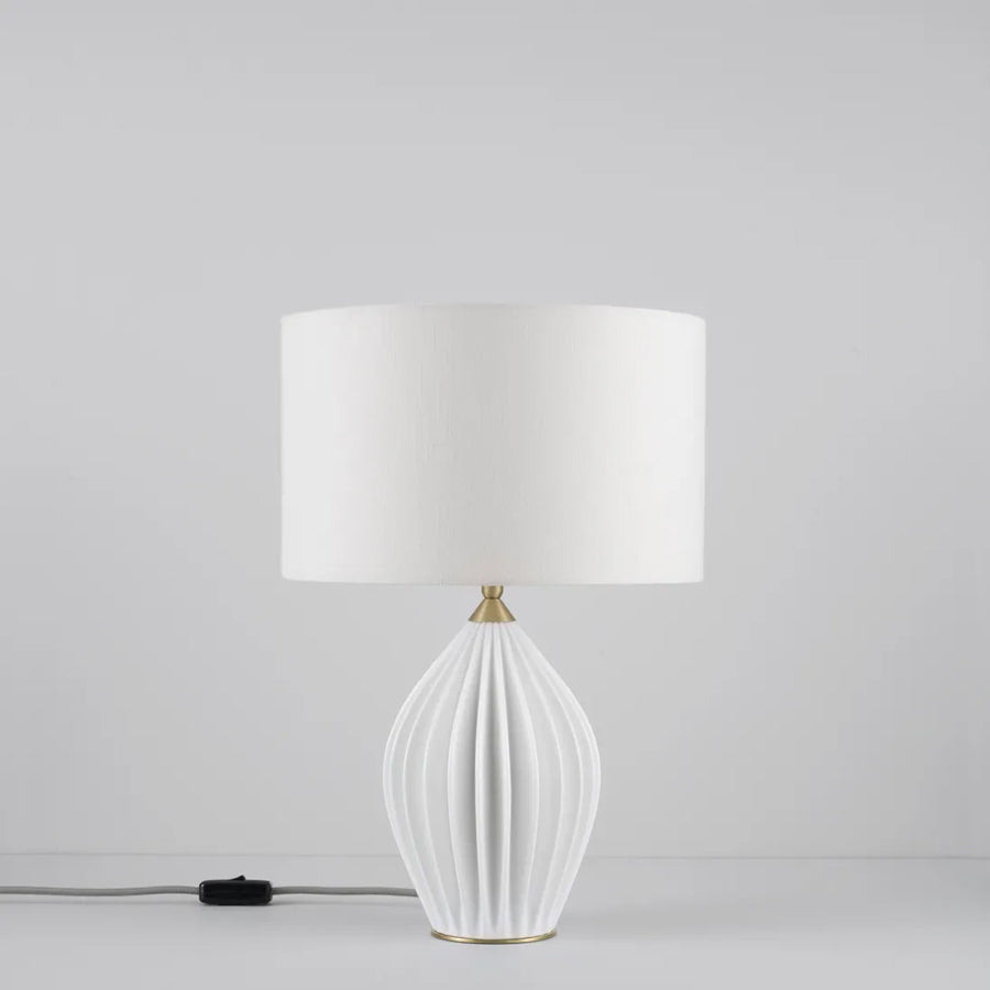 The Fin Queen Table Light marks a new direction for Original BTC, combining our trademark bone china with the addition of a drum shade. The ivory linen shade casts a soft, diffused light, creating beautiful shadows on the intricate hand slip-cast base. The Fin is finished with lacquered, brushed solid brass details and signature cotton braided cable in a pale grey, while the shade sits on an angleable ball and socket to facilitate reading. Also available in a larger 'king' size.