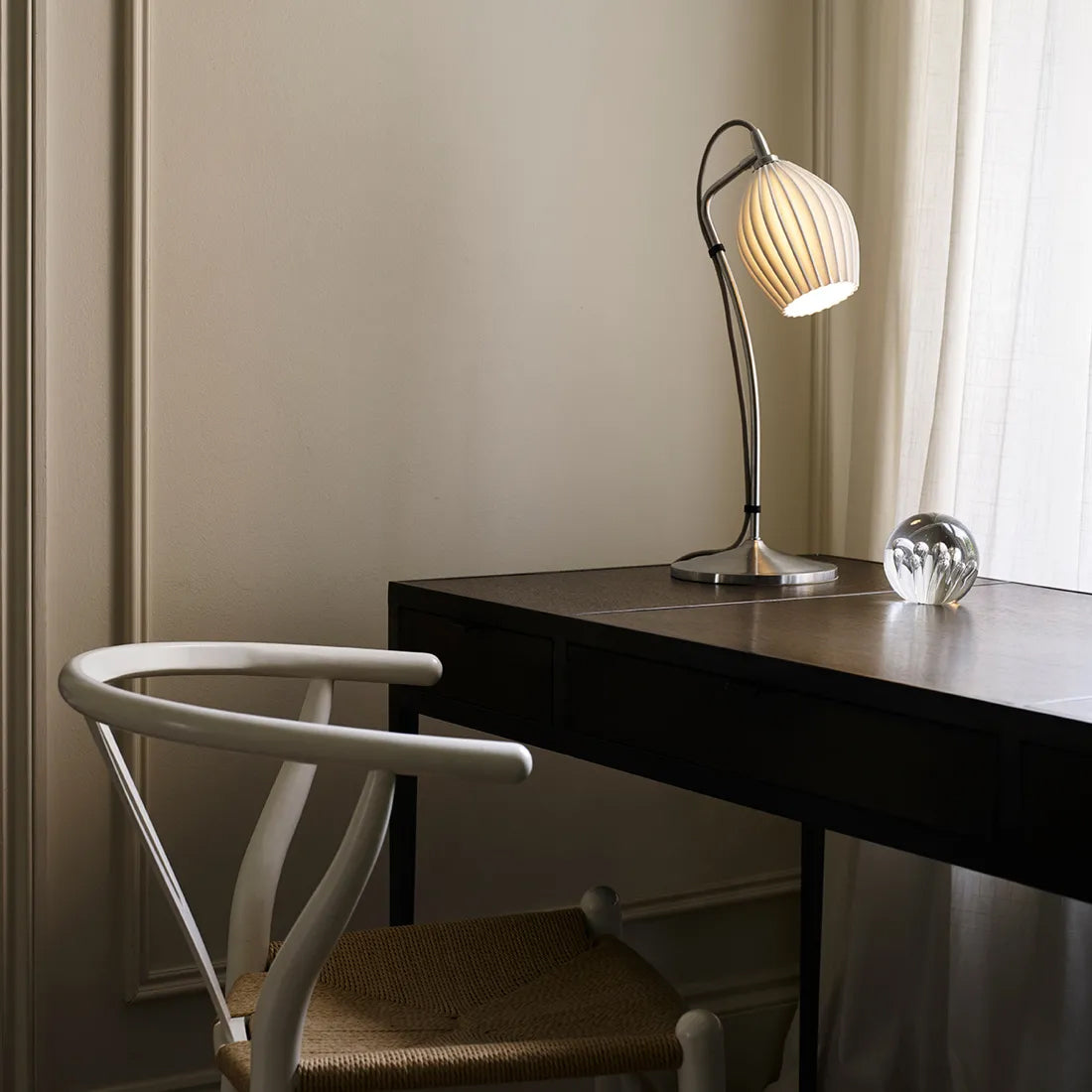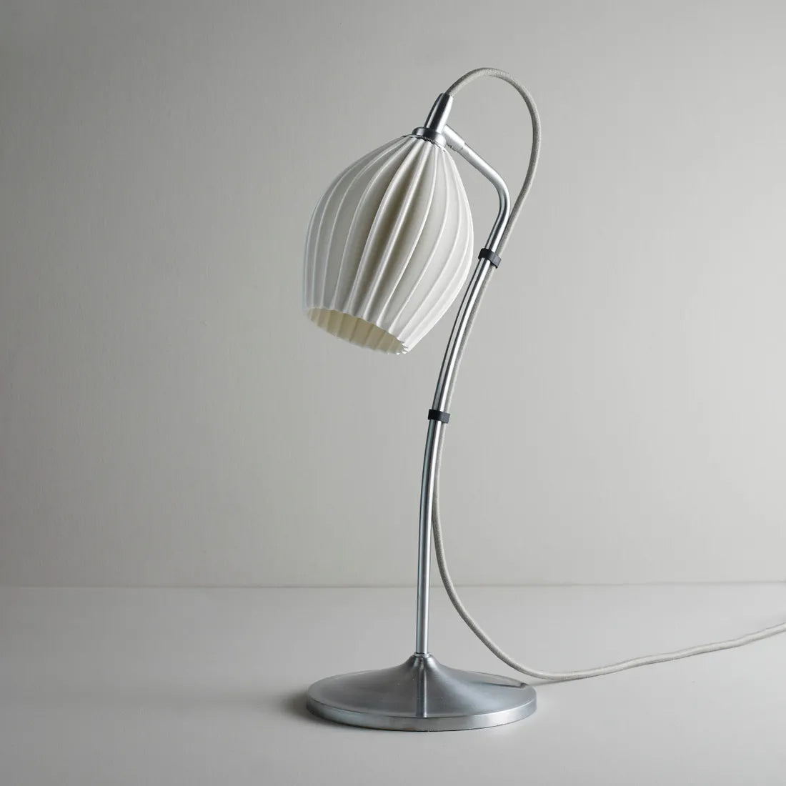The Fin, with its eye-catching bone china shade, expertly moulded into intricate organic shapes, creates dramatic light when lit and retains a sculptural beauty when off. Handmade in Stoke-on-Trent, its distinctive shade is angled onto a satin chrome stem and base. The new grey cotton braided cable, with an inline switch, complements the style beautifully.